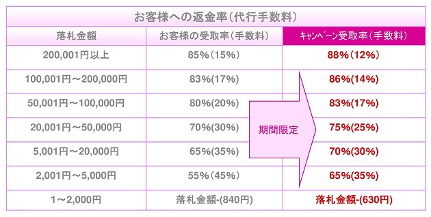 *落札金額が630円未満の場合は、落札金額全てを代行手数料とさせていただきます。